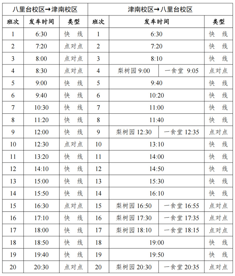 7月1日(周二)至9月4日(周四),泰達校區與八里臺校區、津南校區班車按照假期班車方案運行,9月5日(周五)恢復正常工作日運行。如遇臨時調整,另行通知。